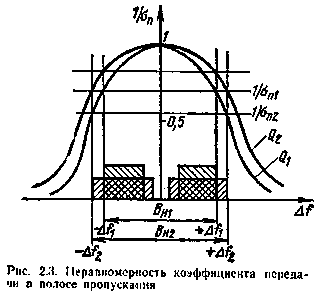 На рисунке представлена зависимость коэффициента неравномерности от расстройки при различной добротности контура. Граница полосы пропускания соответствует некоторой расстройке D f. При переменной расстройке приведенная выше формула является уравнением резонансной характеристики. Из графика зависимости видно, что чем выше спектр сигнала Вн, тем больше расстройка и тем выше подавление крайних частот. Чтобы уменьшить подавление на краях спектра, необходимо уменьшать добротность контура. Из этого следует, что: