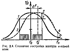 где D f = fo - f’ - разность между частотами настройки входной цепи до и после ее смещения. Смещение происходит из-за вноса емкостей со стороны антенны и входа следующего каскада. Чем меньше смещение настройки h , тем лучше, так как оно снижает коэффициент передачи, увеличивает амплитуду помехи Ufп, ослабляет нижнюю боковую полосу в большей степени, чем верхнюю.