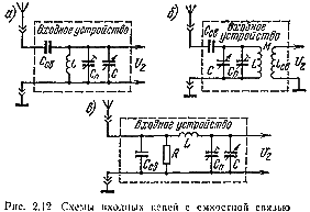 Различают входные устройства с внешнеемкостной (рис. 2.12, а) и б) ) и внутреннеемкостной связью (рис. 2.12 с) ). В таких входных устройствах входной контур включен последовательно в цепь антенны. Ток радиочастоты, протекающий в антенне, возбуждает входной контур. Если fia = fo, то Uвых максимально. Связь с антенной так же делается слабой применением малой емкости связи Ссв для схем а) и б) и большой для схемы рис. с), поскольку емкостное сопротивление выражается формулой: Хс = 1 / w Ссв