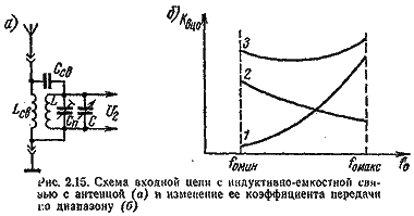 Ток антенны Iа протекает через катушку связи Lсв и создает высокочастотное поле, которое наводит ЭДС в катушке контура L. Если частота поля равна резонансной частоте контура, выходное напряжение входной цепи Uвых максимально и подается на вход следующего каскада. Связь с антенной делается слабой для уменьшения влияния антенны на качественные показатели входной цепи. Слабая связь достигается изменением взаимного расположения катушки связи Lсв относительно катушки контура L.