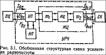 Входной сигнал управляет работой усилительного прибора УП, который в свою очередь управляет поступлением мощности от источника питания ИП к нагрузке. Таким образом эта часть схемы является активным четырехполюсником. Избирательная цепь ИЦ на резонансной частоте позволяет получить наибольшее усиление и необходимую избирательность каскада.