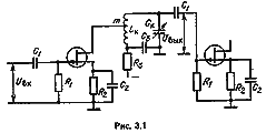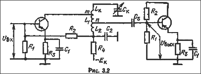 В усилителе по схеме на рис. 3.3 контур трансформаторно связан с коллектором транзистора данного каскада и автотрансформаторно со входом следующего.